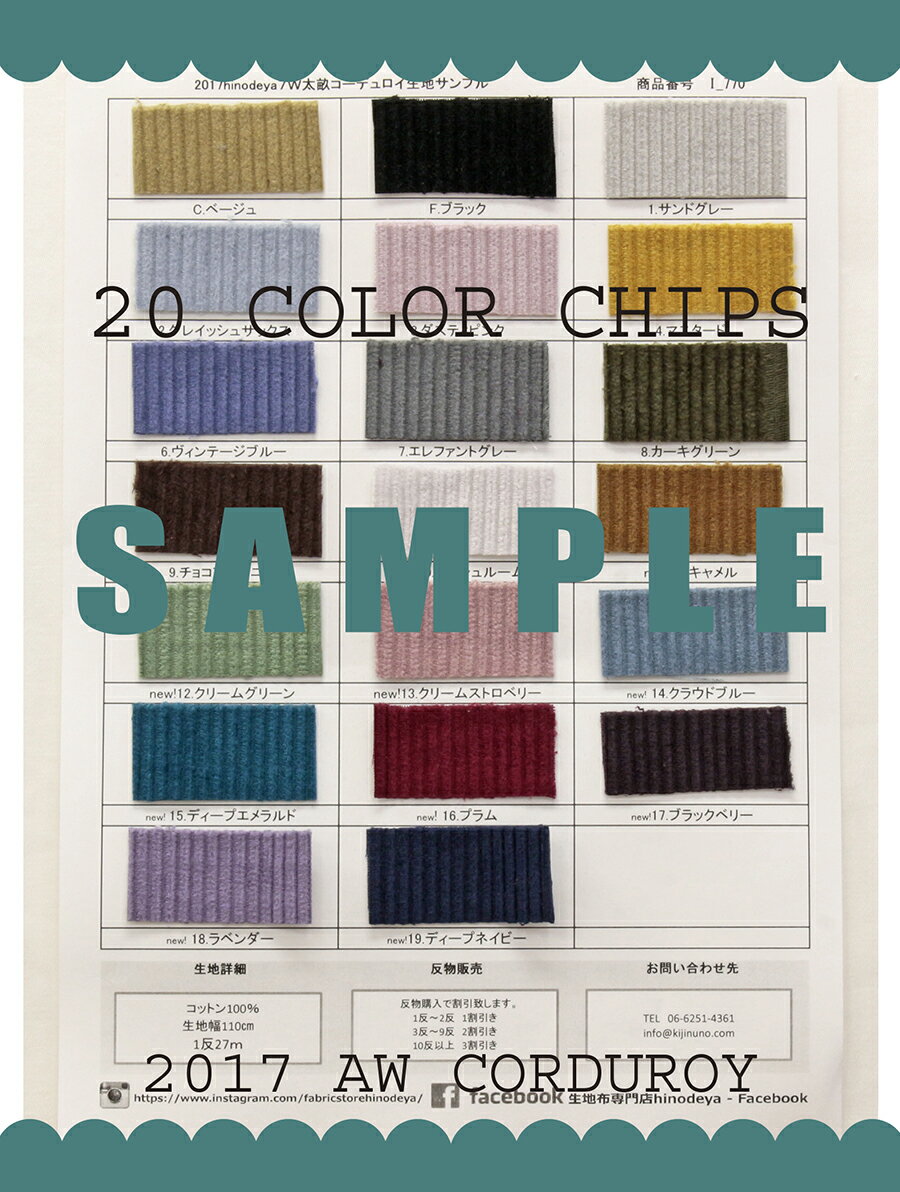当店で人気の7W太畝コーデュロイ生地【全20色】のサンプル表です。